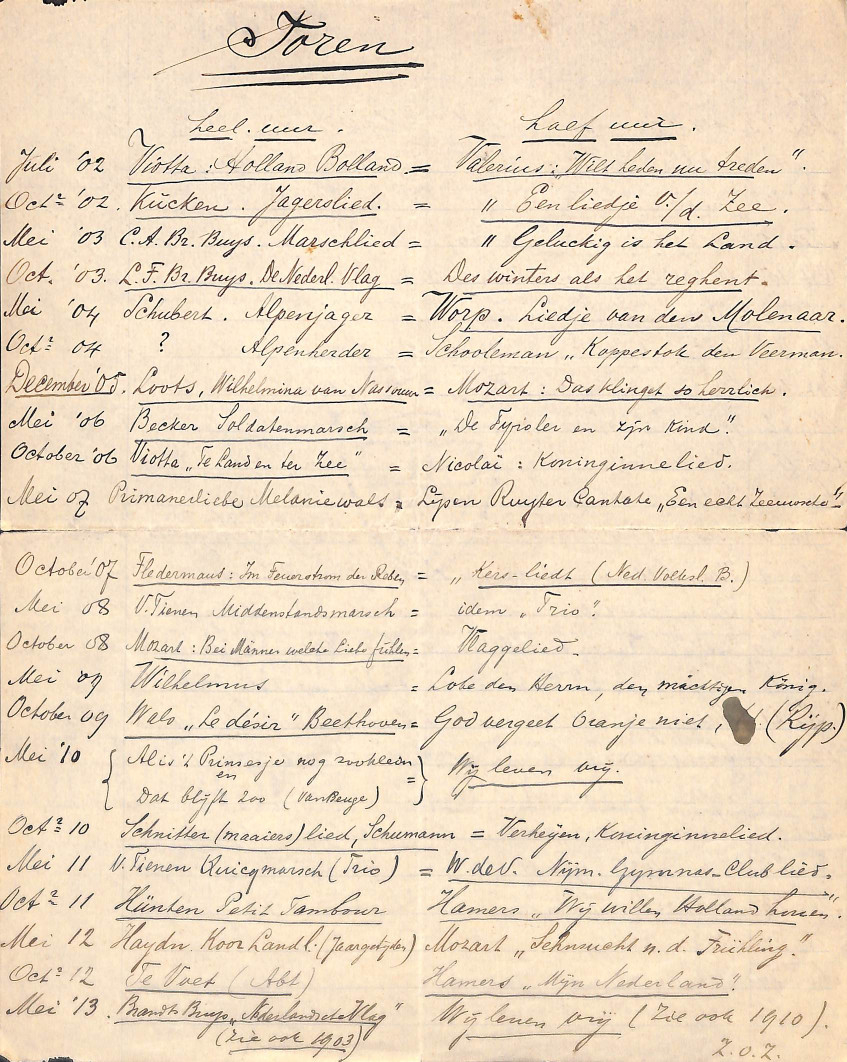 Begon Willem de Vries in 1897 met het waarnemen van de orgeltaken van zijn broer-en-organist Hendrik in Nijmegen (Kler-H-de 1995), pas in 1902 werd hij aangesteld als beiaardier (bron: De Gelderlander 19020510). Van de beiaardier Willem de Vries zijn meer beiaard-handschriften bewaard gebleven dan orgelstukken. Dat is niet zo vreemd; immers, de geschreven nalatenschap van organisten is veelal beperkt tot hun eventuele composities, orgellessen, en concertprogramma's. De muziekliteratuur voor orgelconcerten is immers in druk beschikbaar, terwijl een professionele organist voor het begeleiden van kerkdiensten vaak niet meer nodig heeft dan het liederenboekje. Improviseren en zang begeleiden is een standaard onderdeel van het vak. Voor de beiaardier ligt dat iets anders. Voor beiaard is minder kant-en-klare muziekliteratuur beschikbaar en geschikt. Maar ook het versteken van de trommels ("tonnen") van de automatische speelwerken van de torens vraagt de nodige extra voorbereiding. Al is er over het beiaardleven van Willem de Vries dus minder bekend in de literatuur dan over zijn orgelleven, zijn notities voor beiaard die aan zijn opvolger - Arie Peters - gegeven zijn, zijn zeer de moeite waard. Zijn beiaardcarrière begint met eerbetoon aan zijn voorganger, door het muziekstuk dat op dat moment op de trommel van het automatische speelwerk staat op papier vast te leggen: Reich mir die Hand van zijn voorganger Engel. Het stuk is gedateerd 1901 en vermeldt Engels levenseinde op 28-29 maart 1902. Tevens is dit het begin van zijn eigen administratie. Een eerste eigen vermelding van het versteken is die van juli 1902, en wel Viotta: Holland Bolland op het hele uur, en Valerius: Wilt heden nu treden op het halve uur. De lijst is keurig bijgehouden tot en met oktober 1935. Het laatste liedje: Kallenbach: de vroolijke Jongen is keurig terug te vinden in zijn administratie. Opvolger Arie Peters volgde het voorbeeld van zijn voorganger en maakte en bewaarde aantekeningen van de melodieën op de trommel. |
